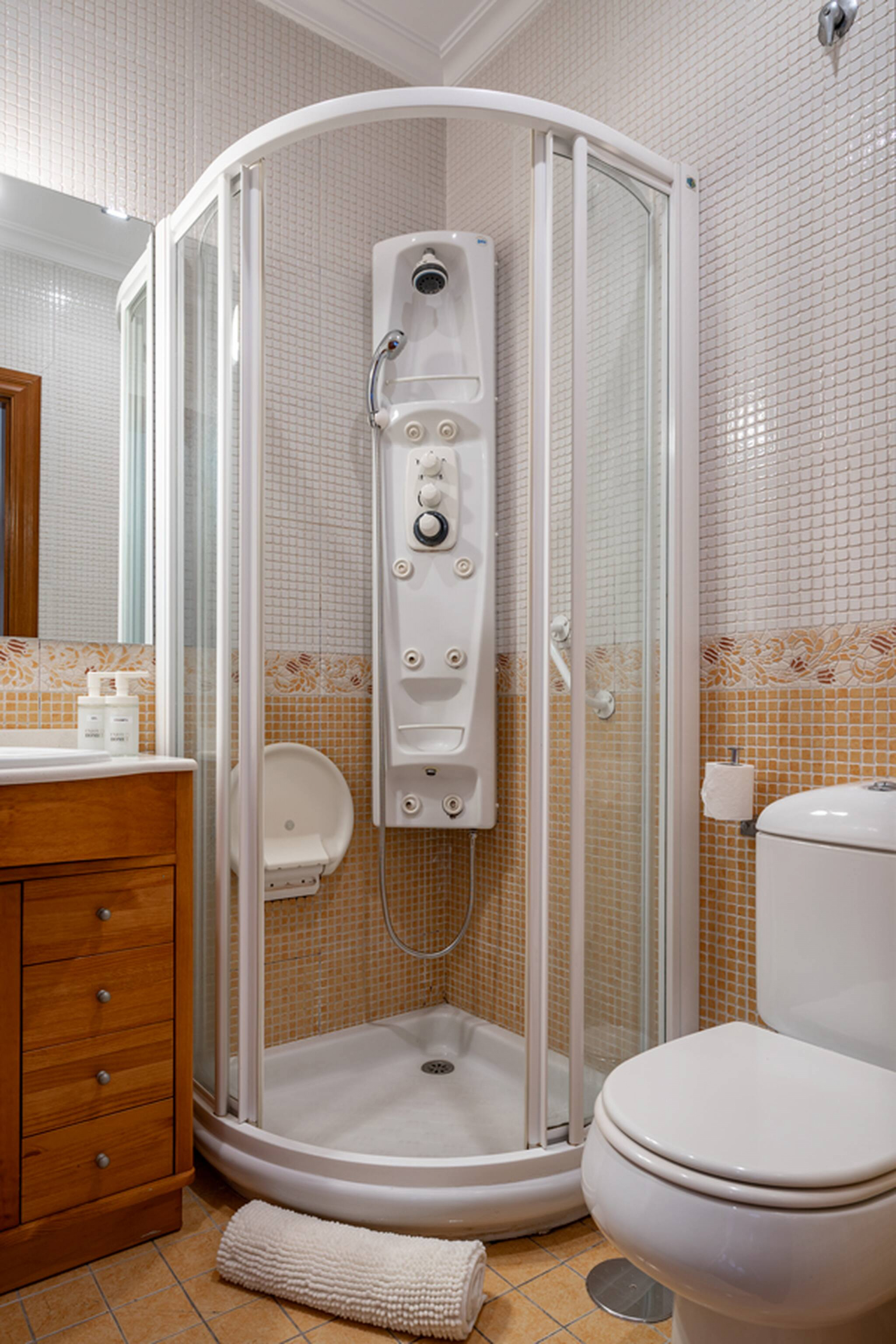 Baño con plato de ducha y cocina nuevos y totalmente equipados. Salón amplio con TV de pantalla plana de 55 pulgadas.