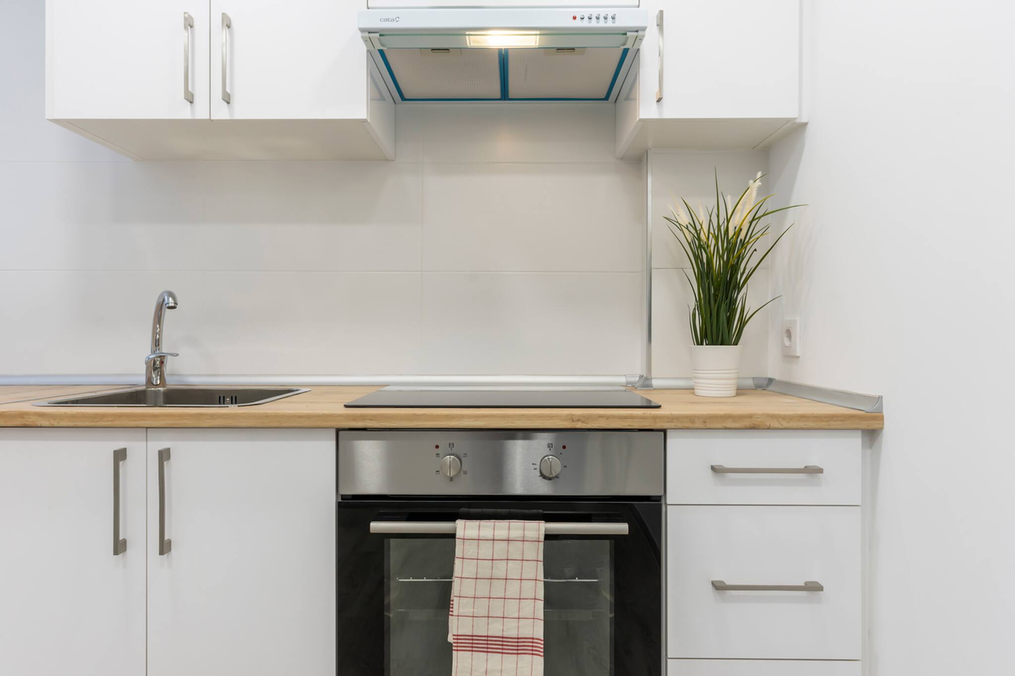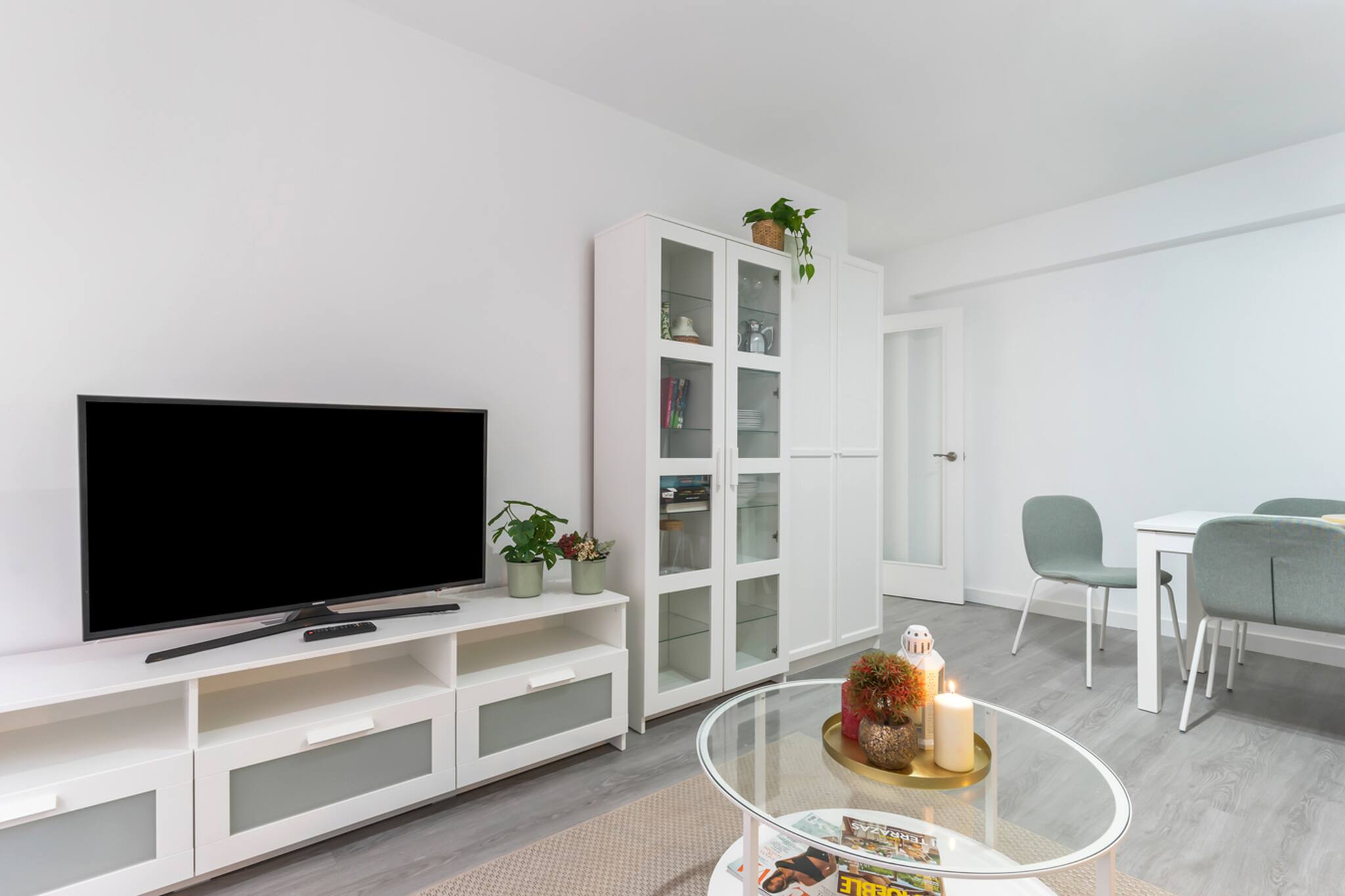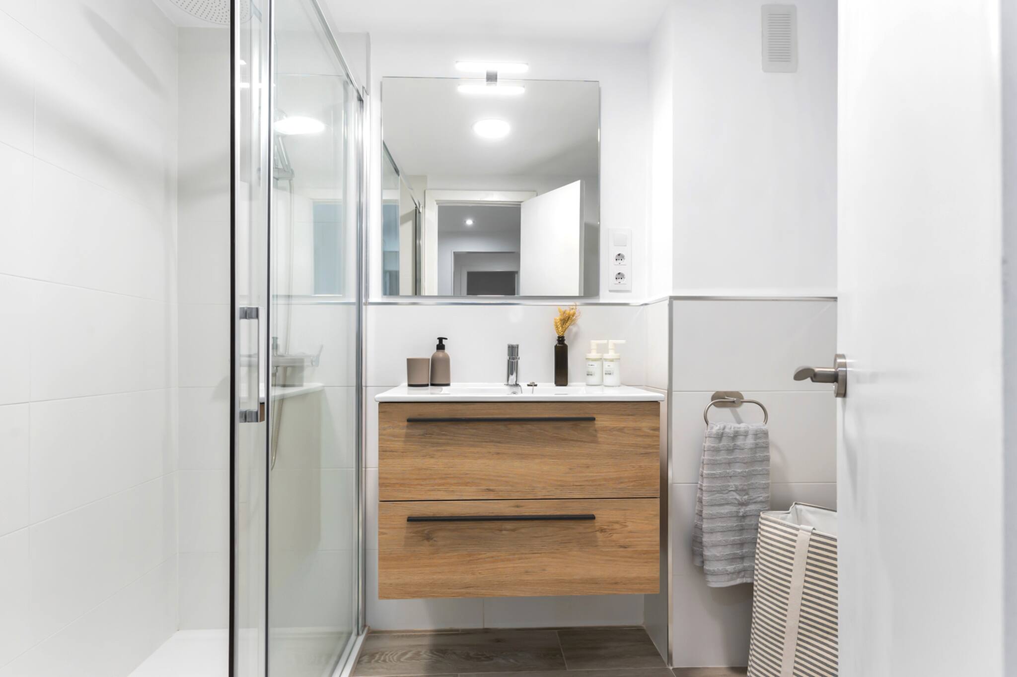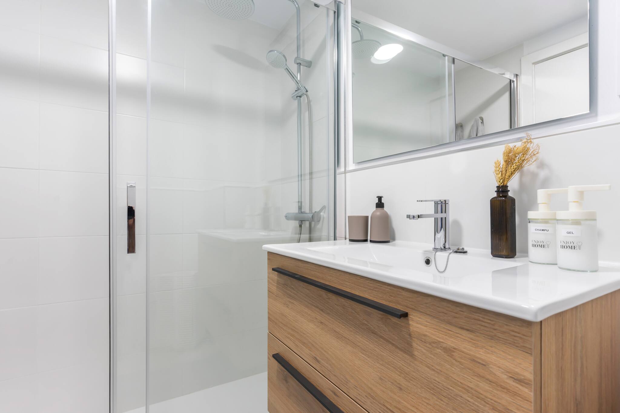 Salón, baño con plato de ducha y cocina totalmente equipada.