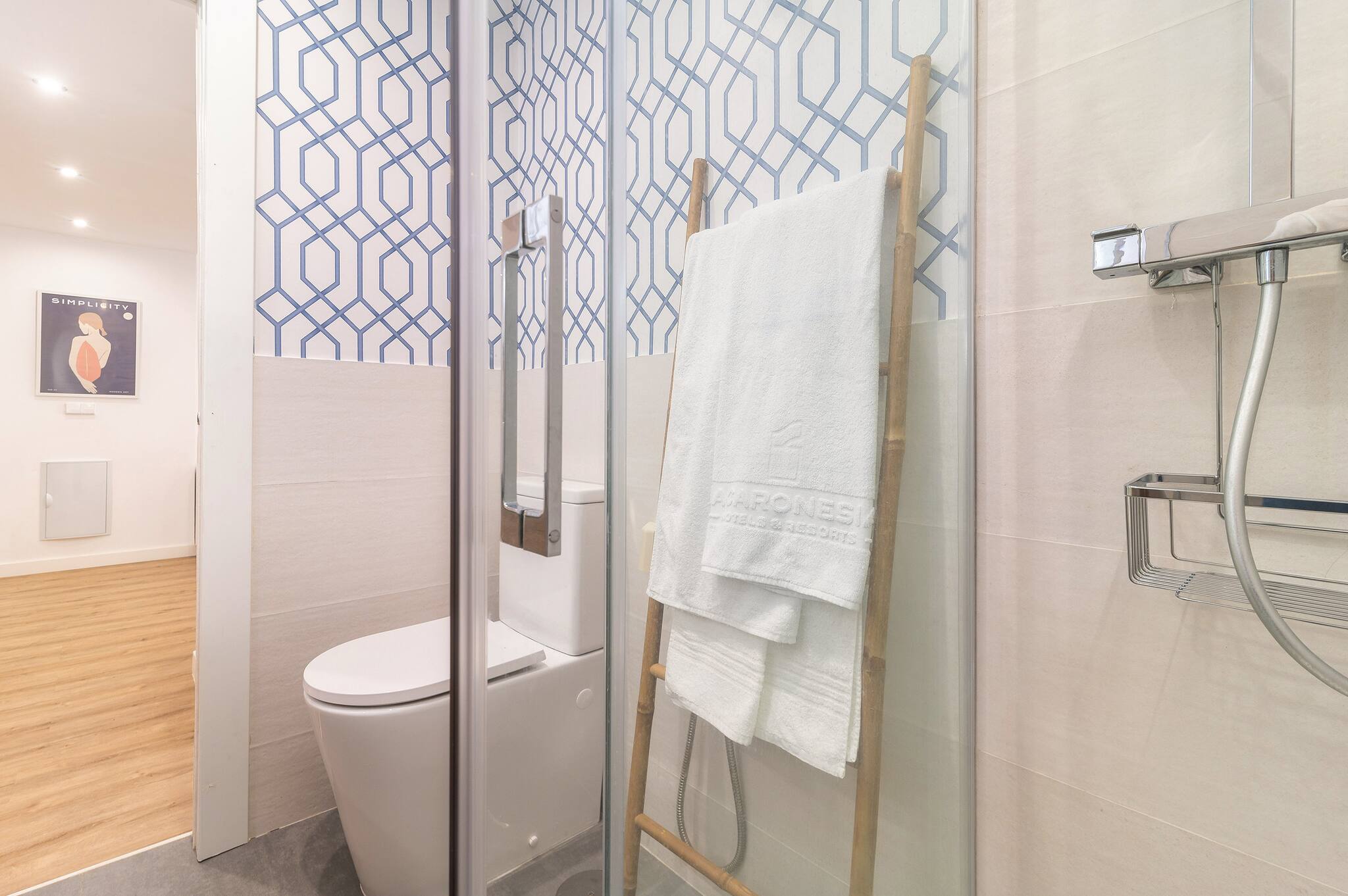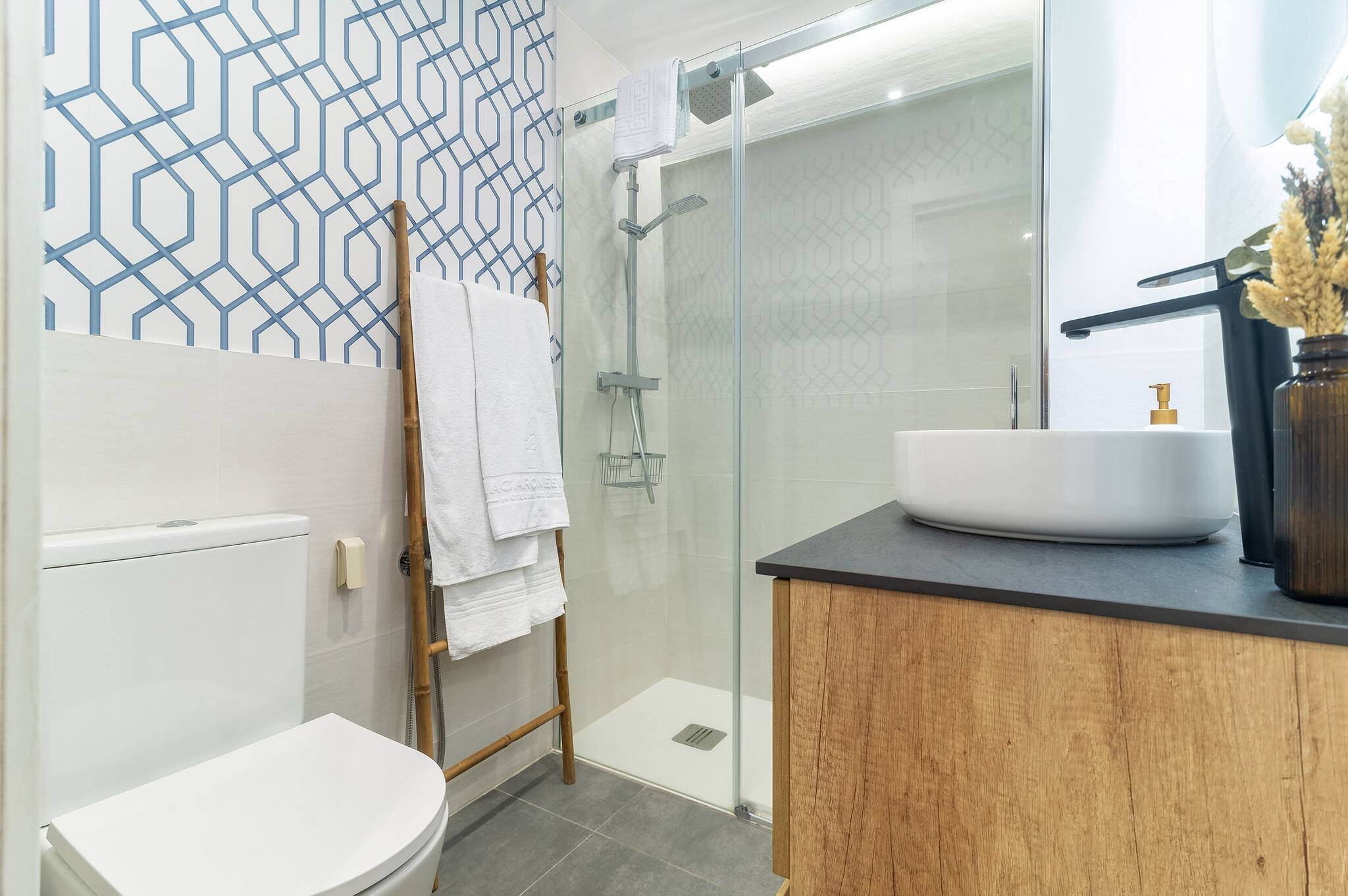 Baño con plato de ducha y cocina nuevos y totalmente equipados. Salón amplio con TV de pantalla plana de 55 pulgadas.
