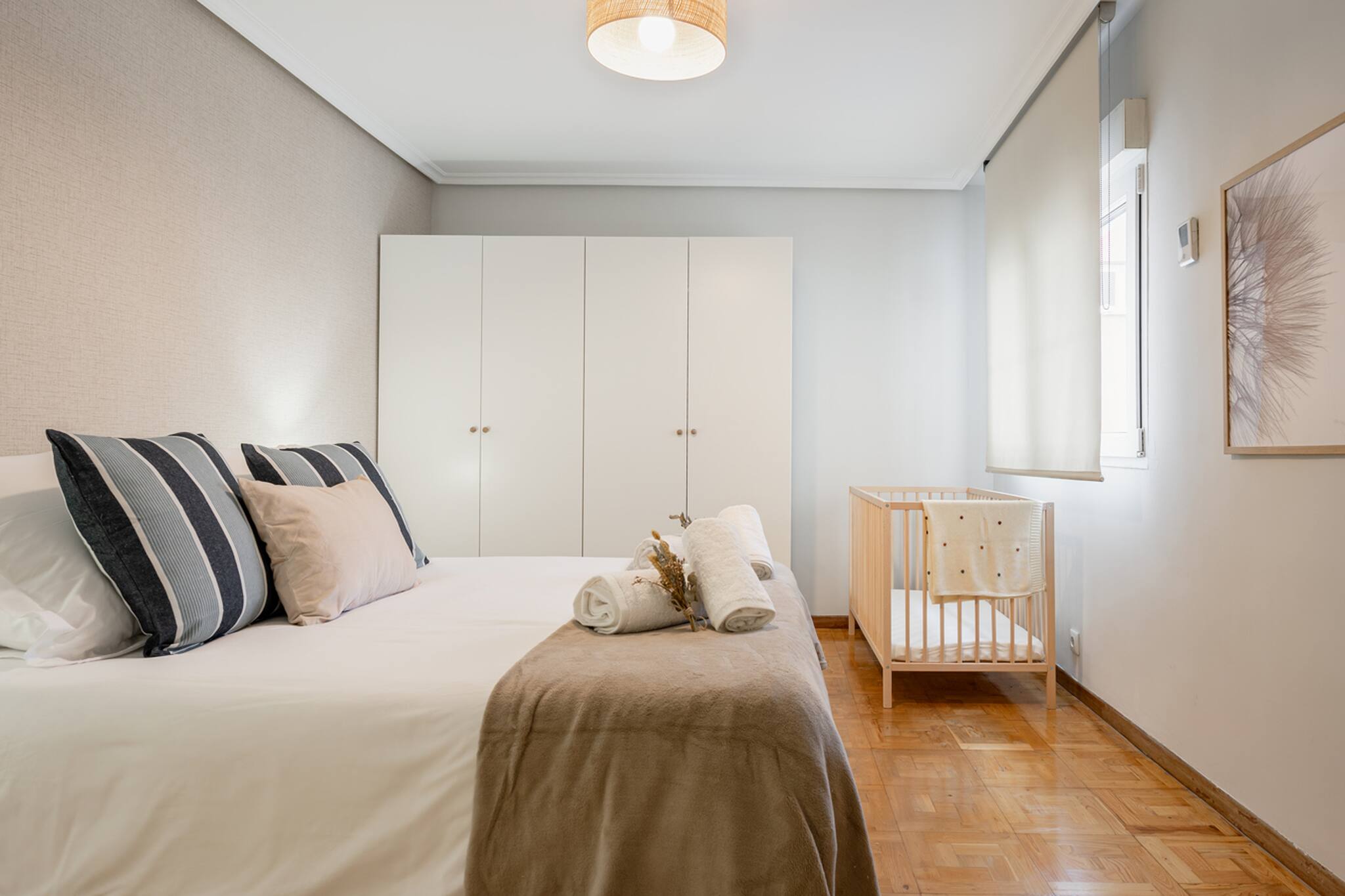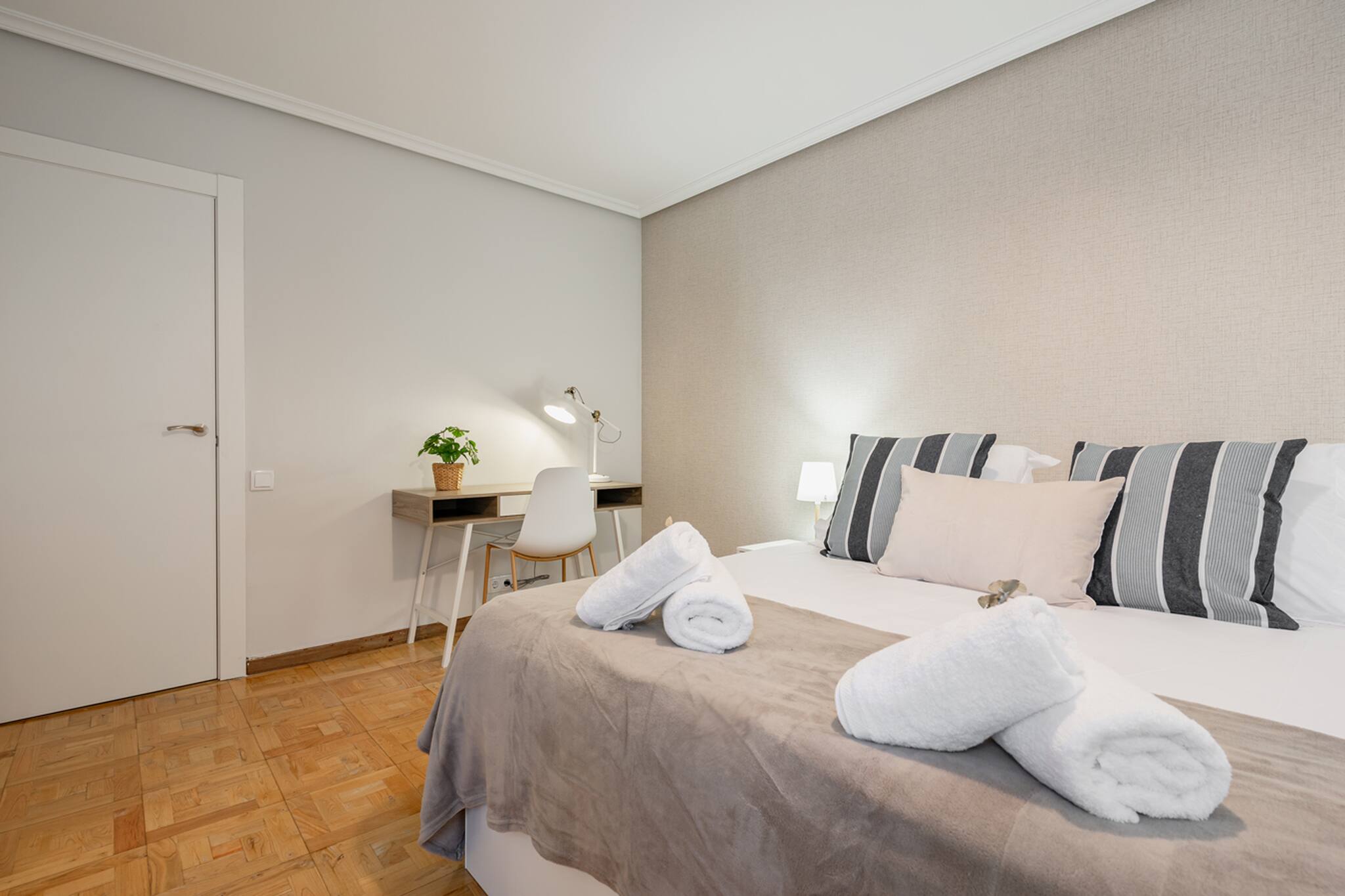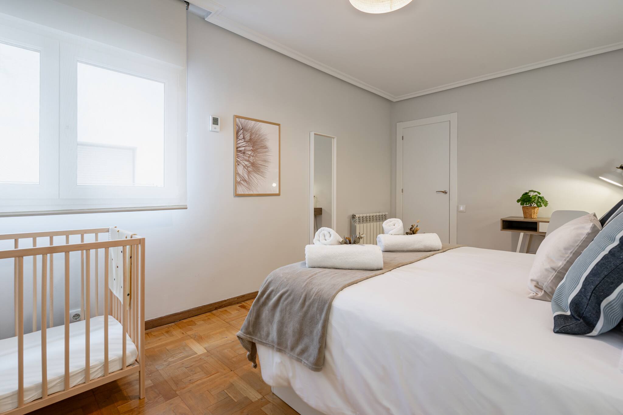 El Apartamento Dalí tiene 3 habitaciones: principal con cama matrimonial de tamaño 150cm, otra con 2 camas individuales de 90cm y la otra con una cama individual de 90cm y un escritorio perfecto para teletrabajar.
