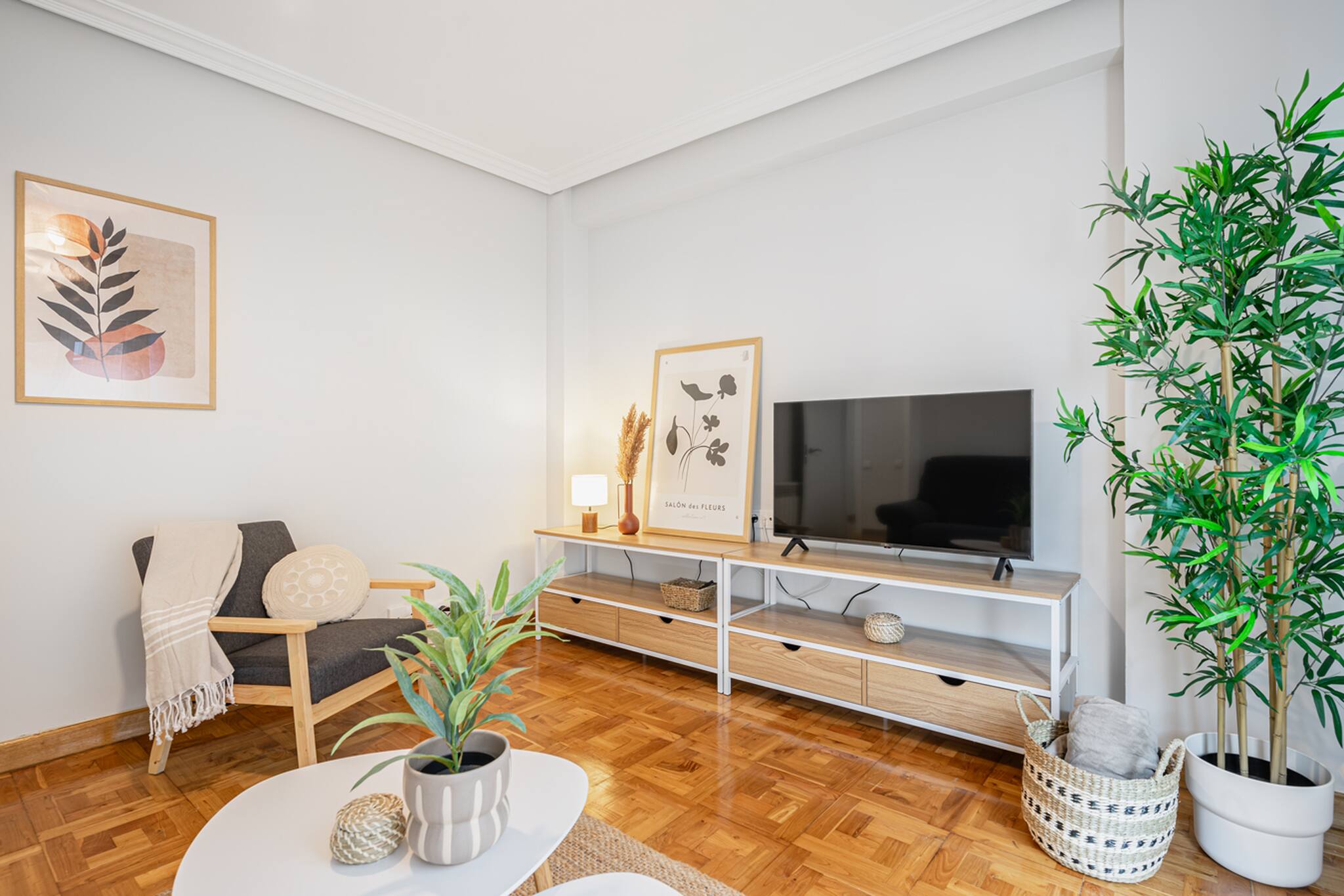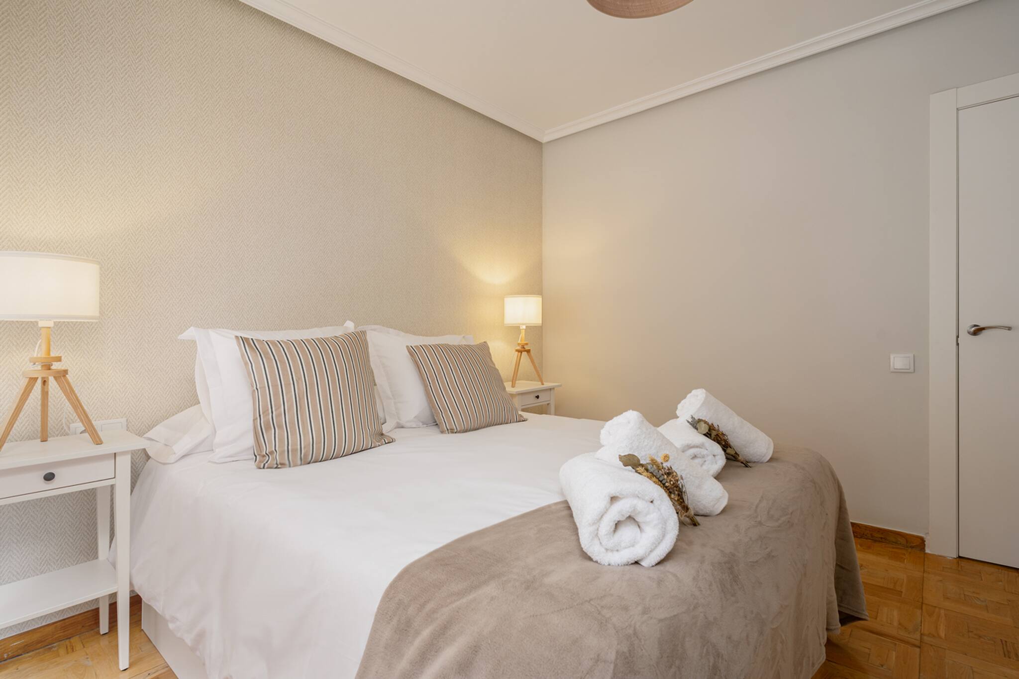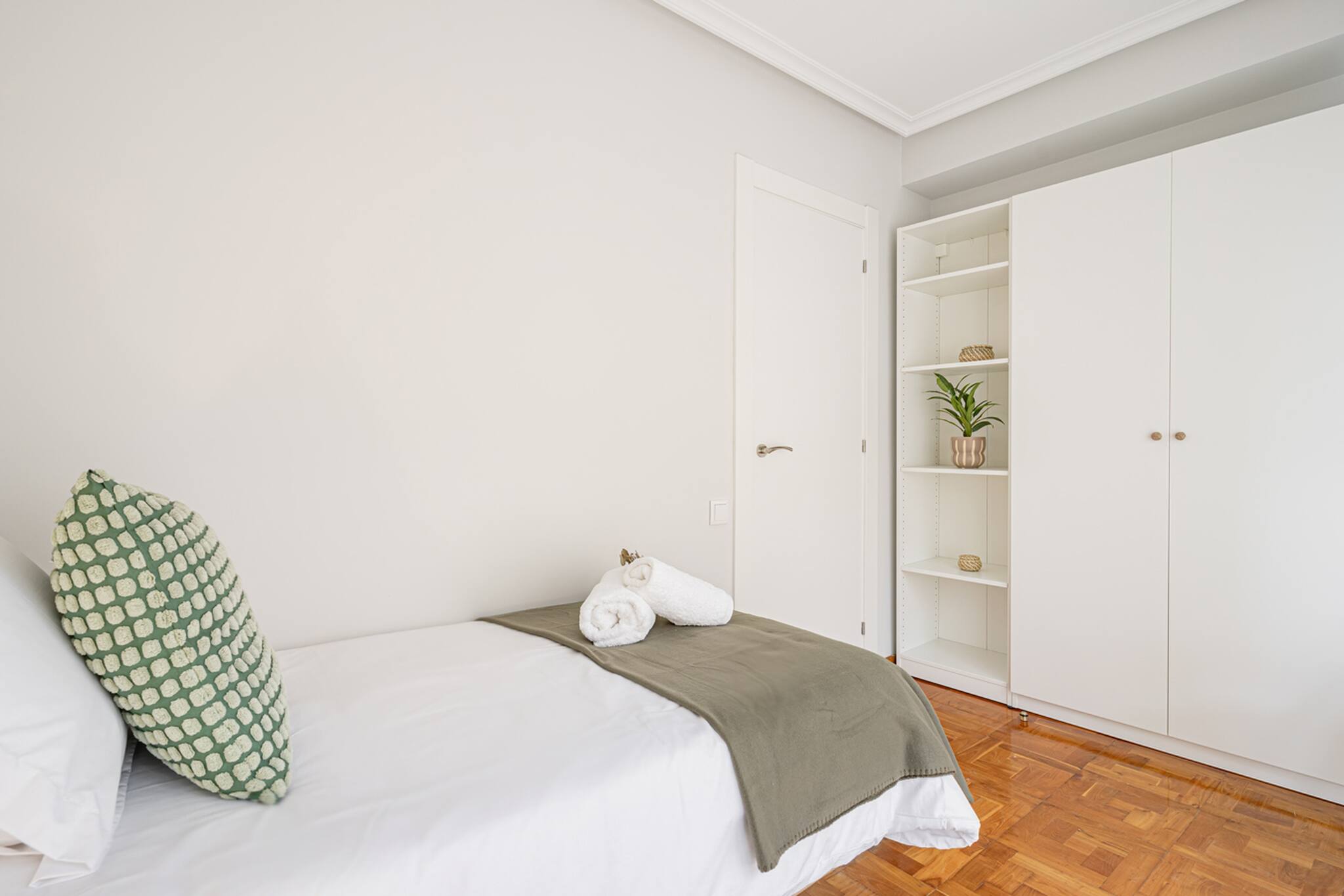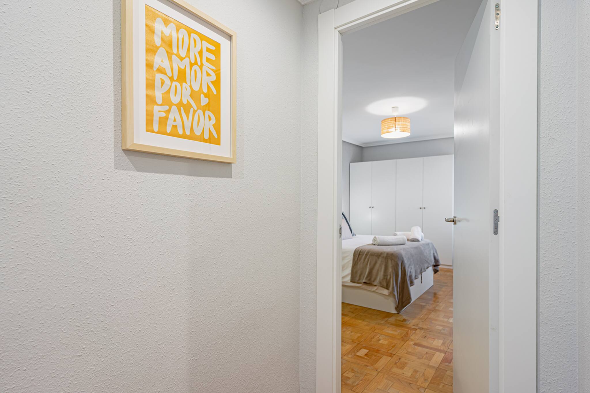 El Apartamento Dalí tiene 3 habitaciones: principal con cama matrimonial de tamaño 150cm, otra con 2 camas individuales de 90cm y la otra con una cama individual de 90cm y un escritorio perfecto para teletrabajar.