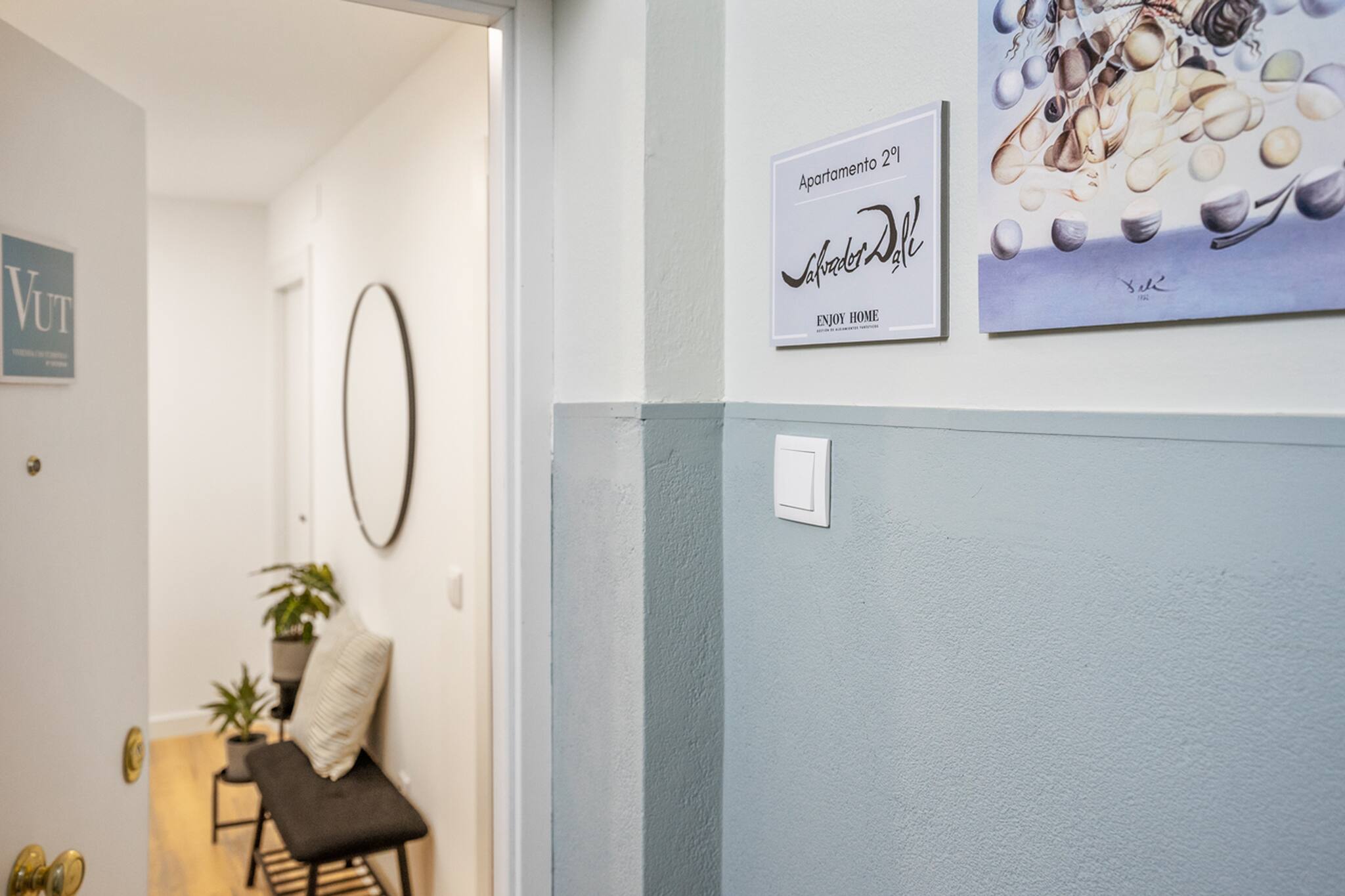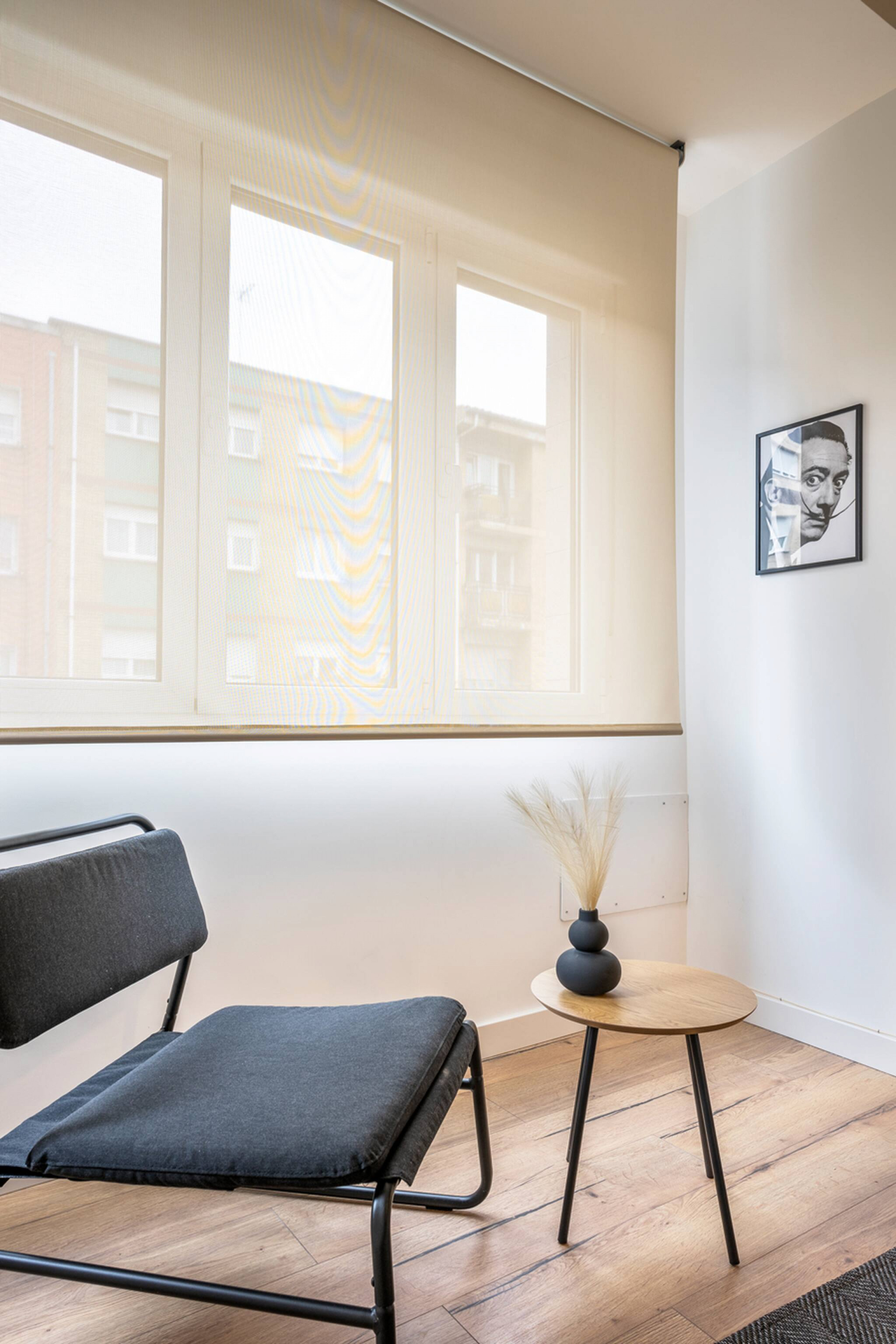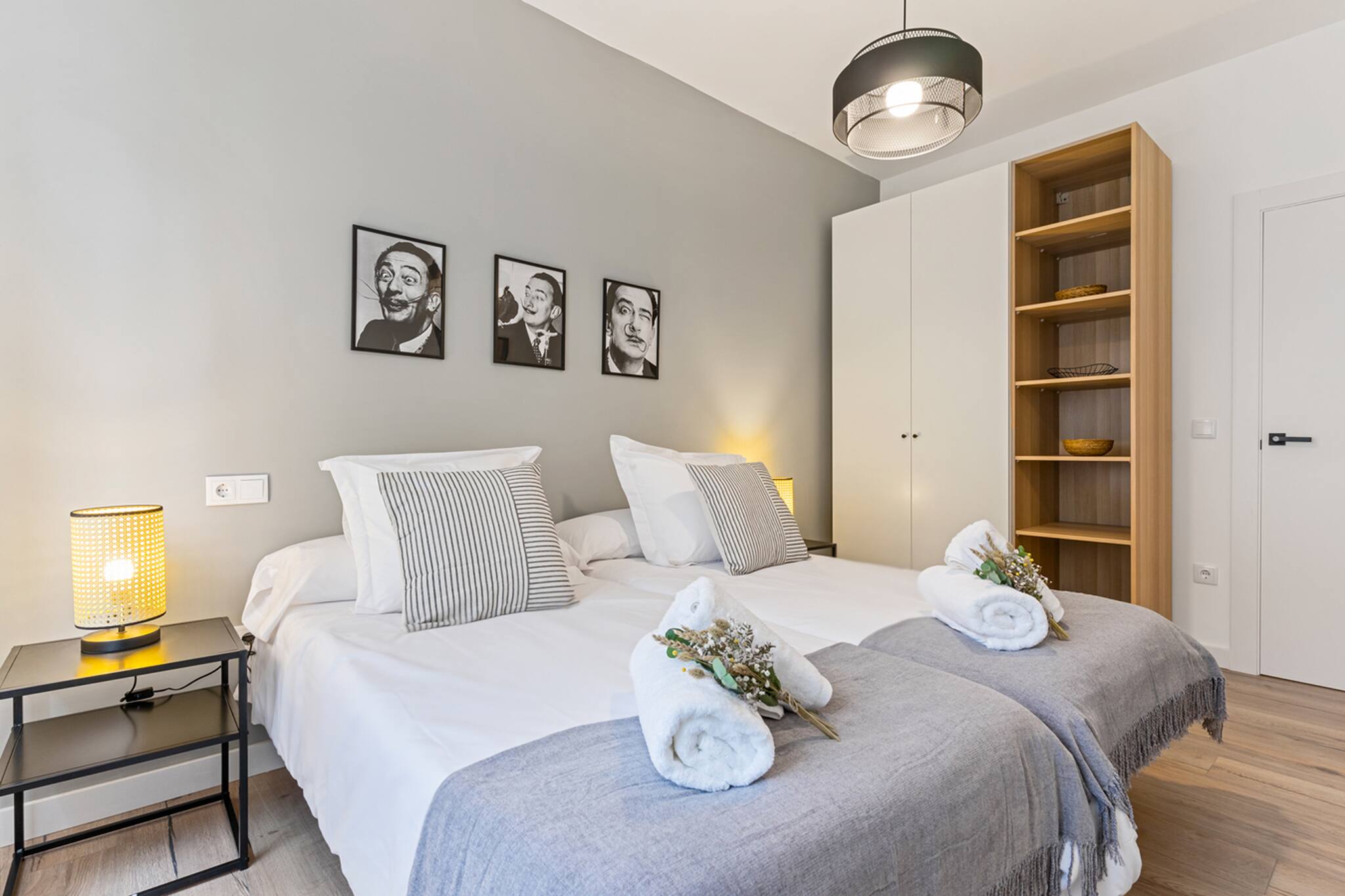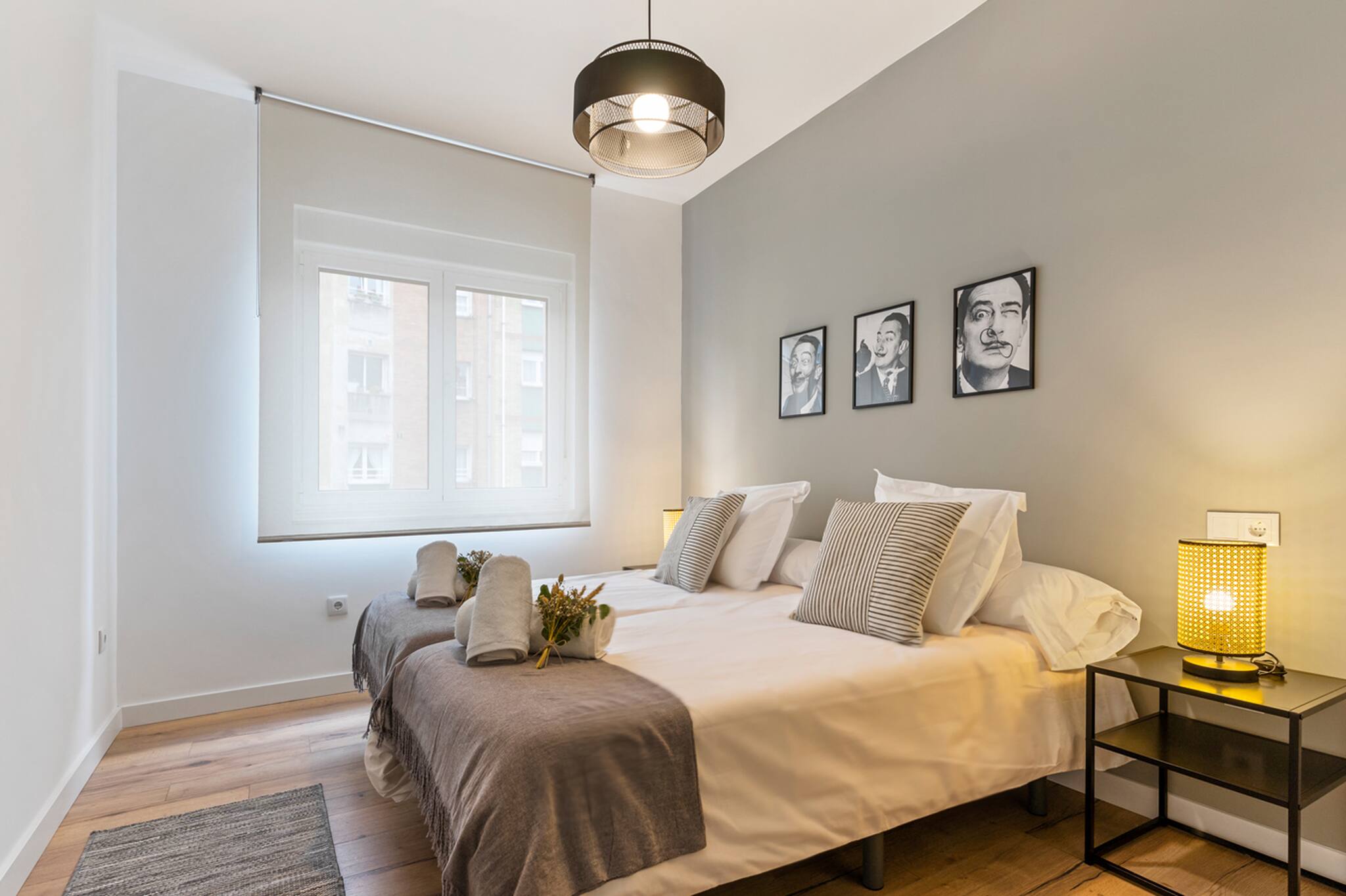 El Apartamento Dalí tiene 3 habitaciones: principal con cama matrimonial de tamaño 150cm, otra con 2 camas individuales de 90cm y la otra con una cama individual de 90cm y un escritorio perfecto para teletrabajar.