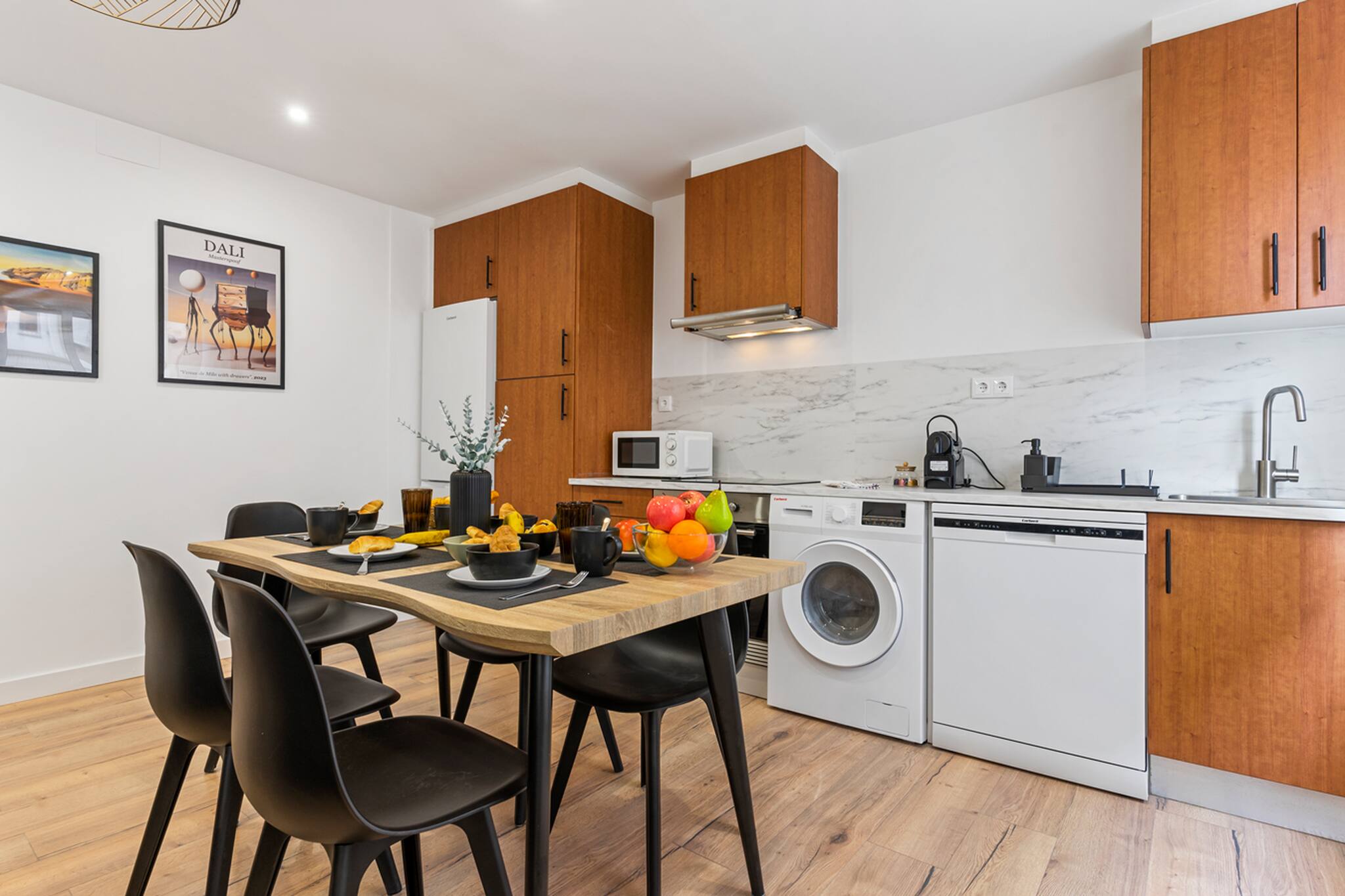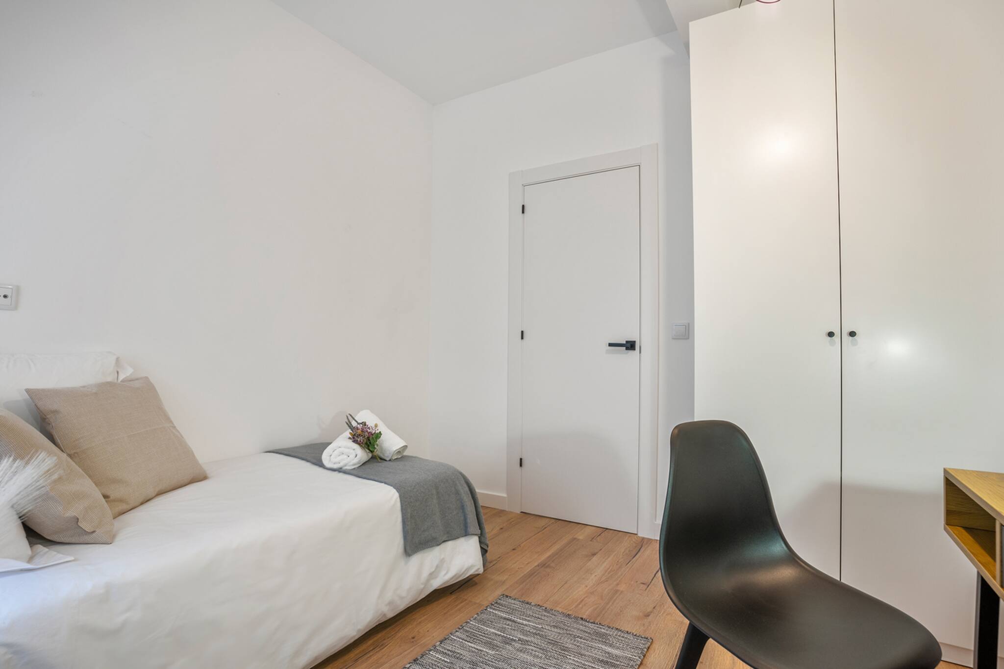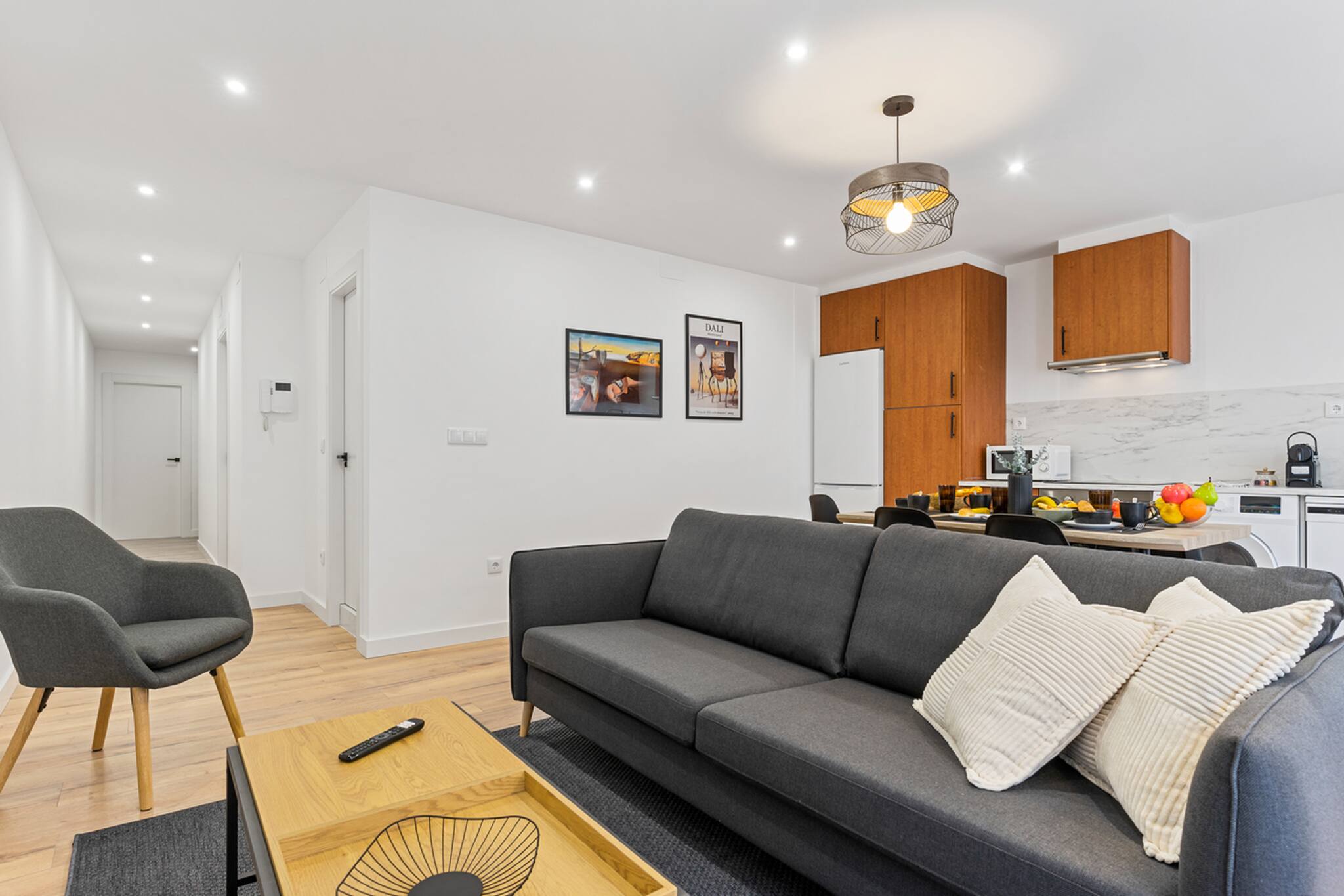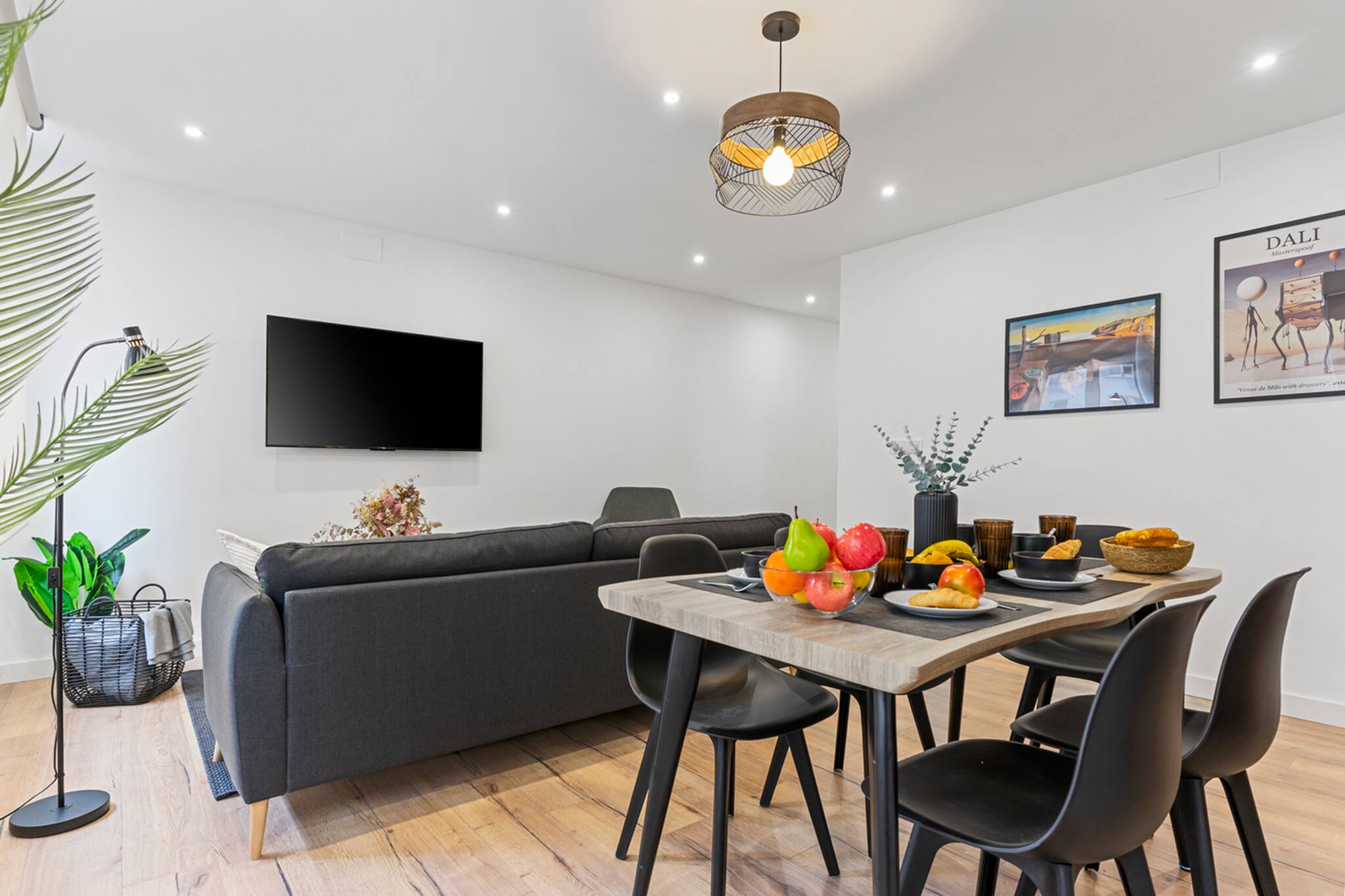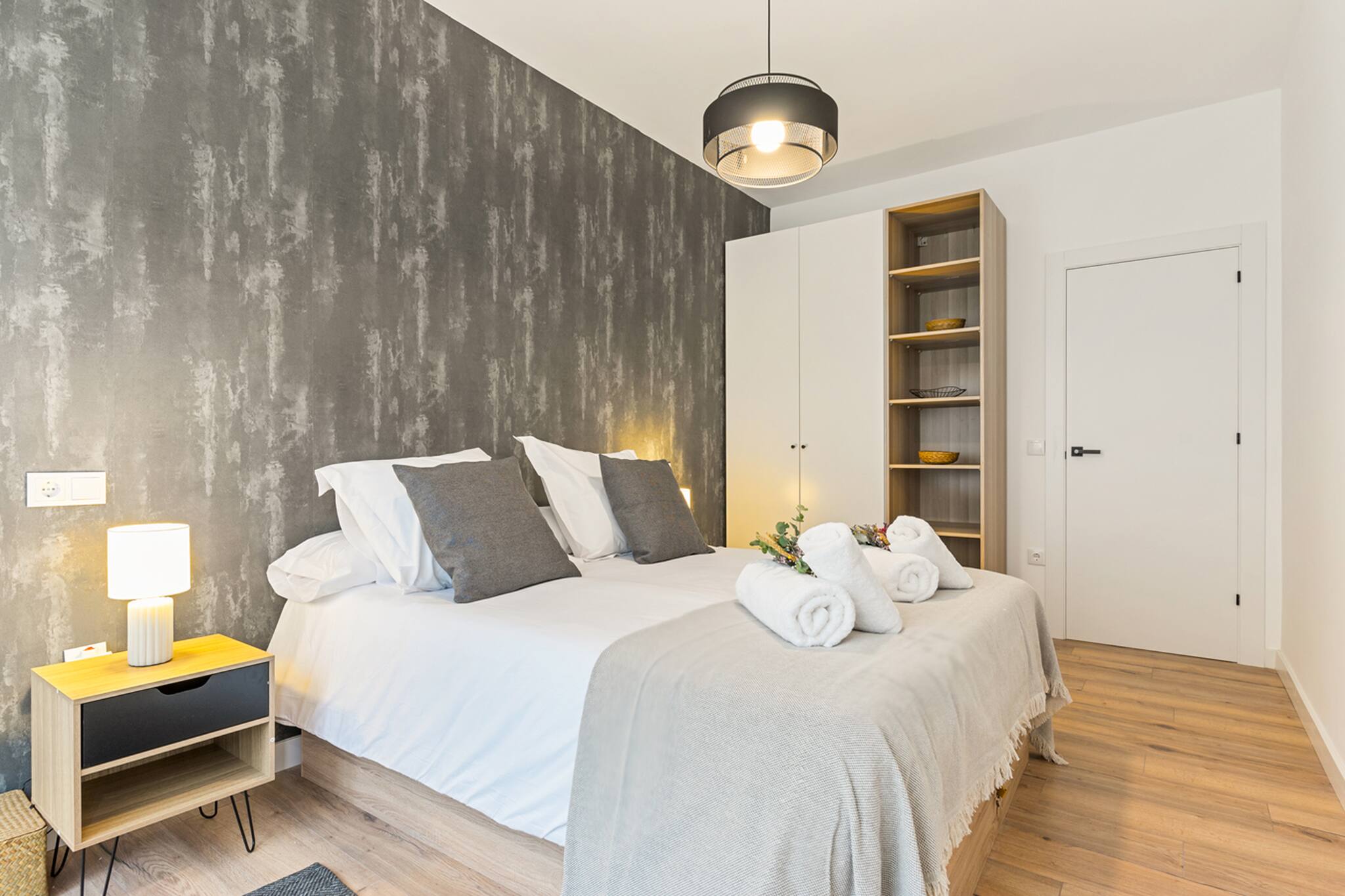 El Apartamento Dalí tiene 3 habitaciones: principal con cama matrimonial de tamaño 150cm, otra con 2 camas individuales de 90cm y la otra con una cama individual de 90cm y un escritorio perfecto para teletrabajar.