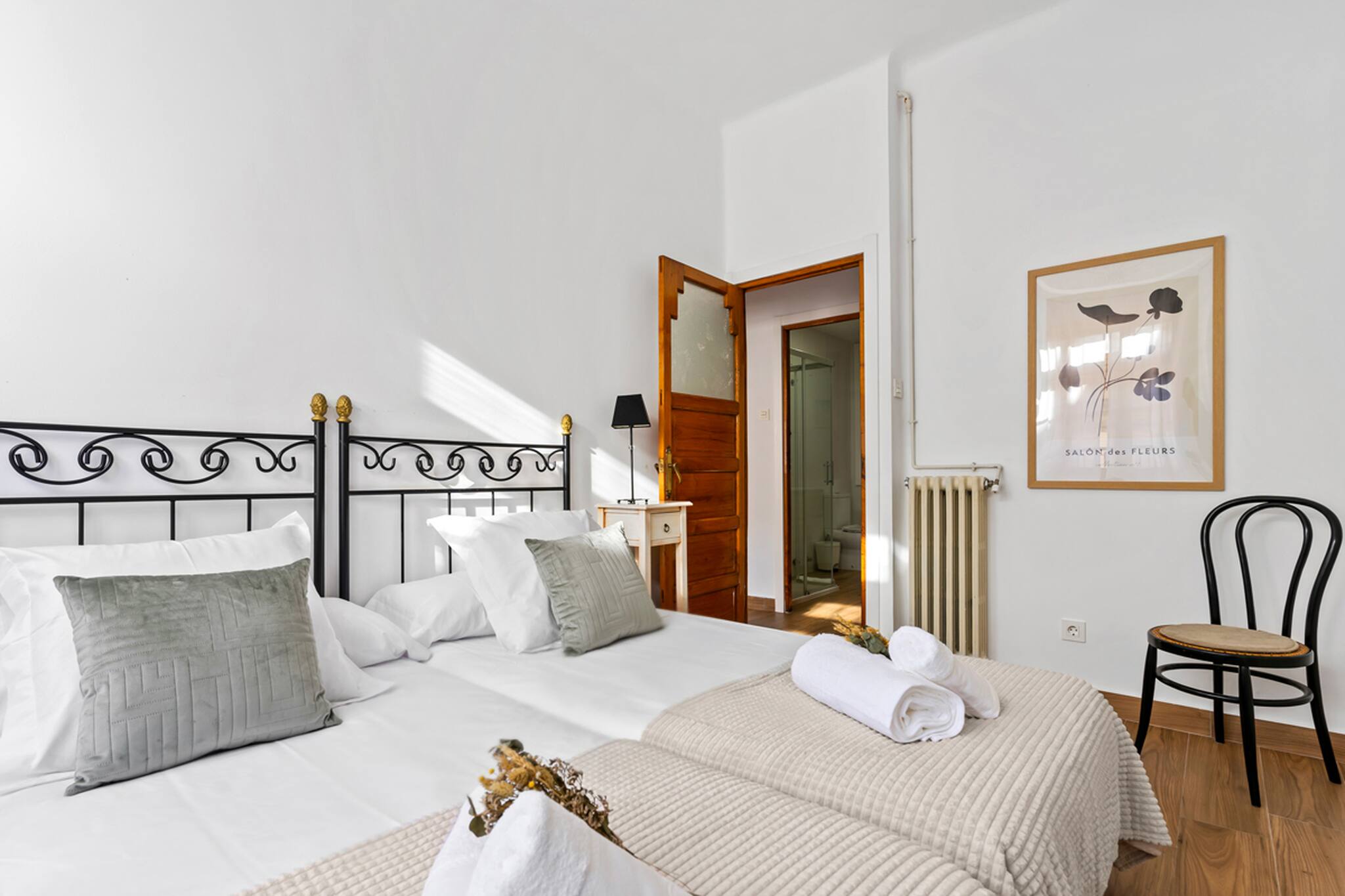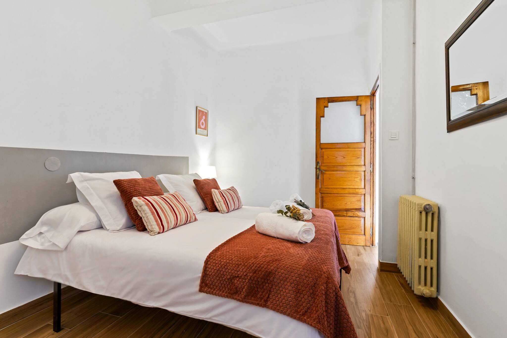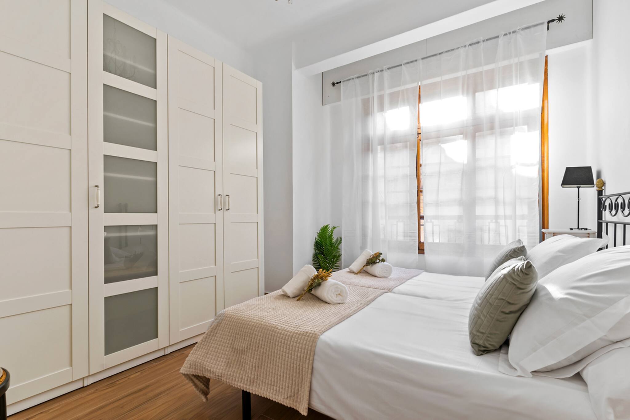 Apartamento grande y espacioso, con dos dormitorios con cama matrimonial y una habitación con despacho ideal para trabajar.