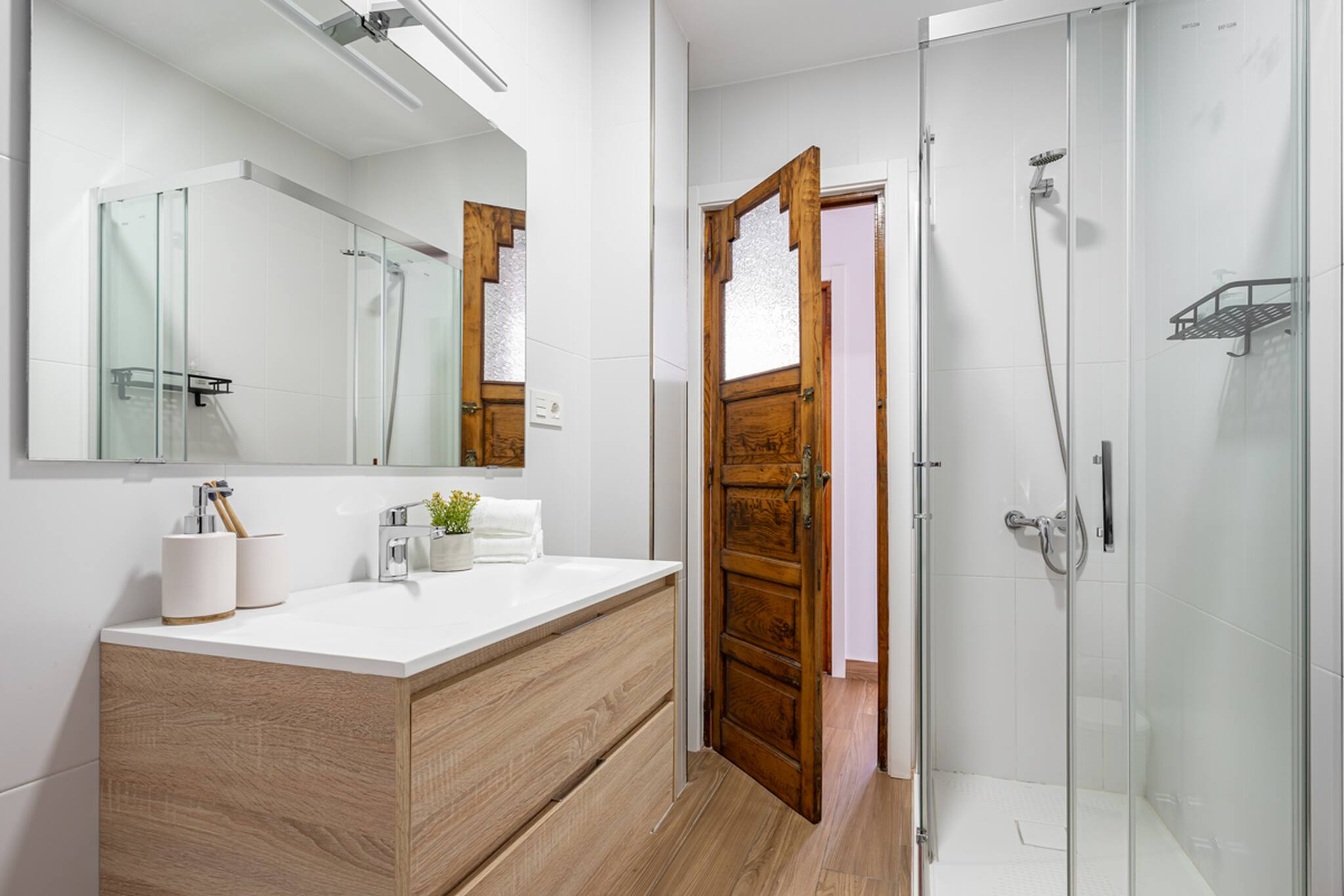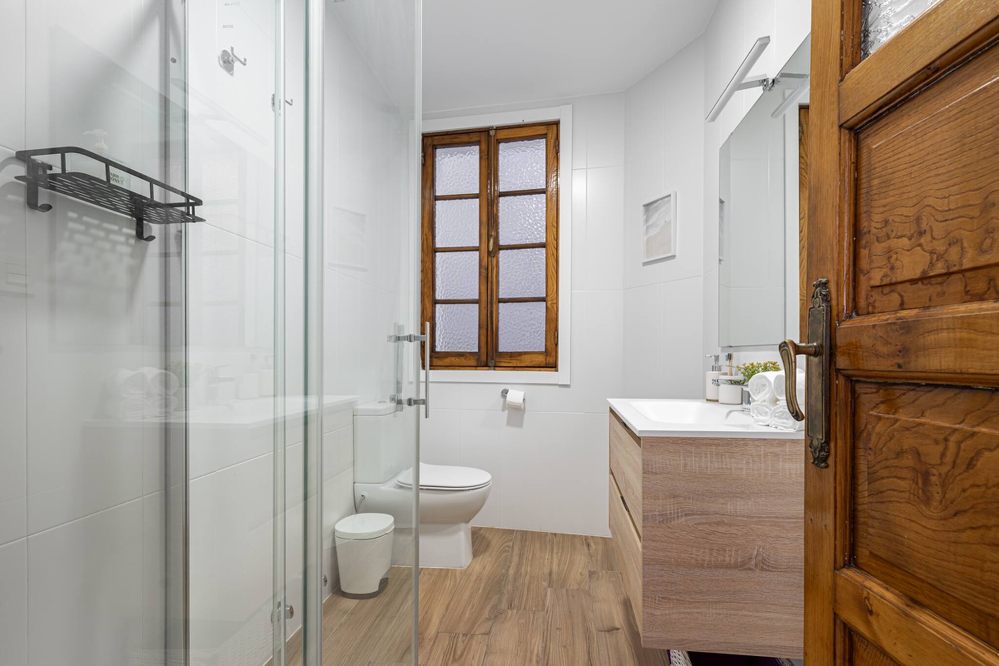 Baño con plato de ducha y cocina nuevos y totalmente equipados. Salón amplio con TV de pantalla plana de 55 pulgadas.
