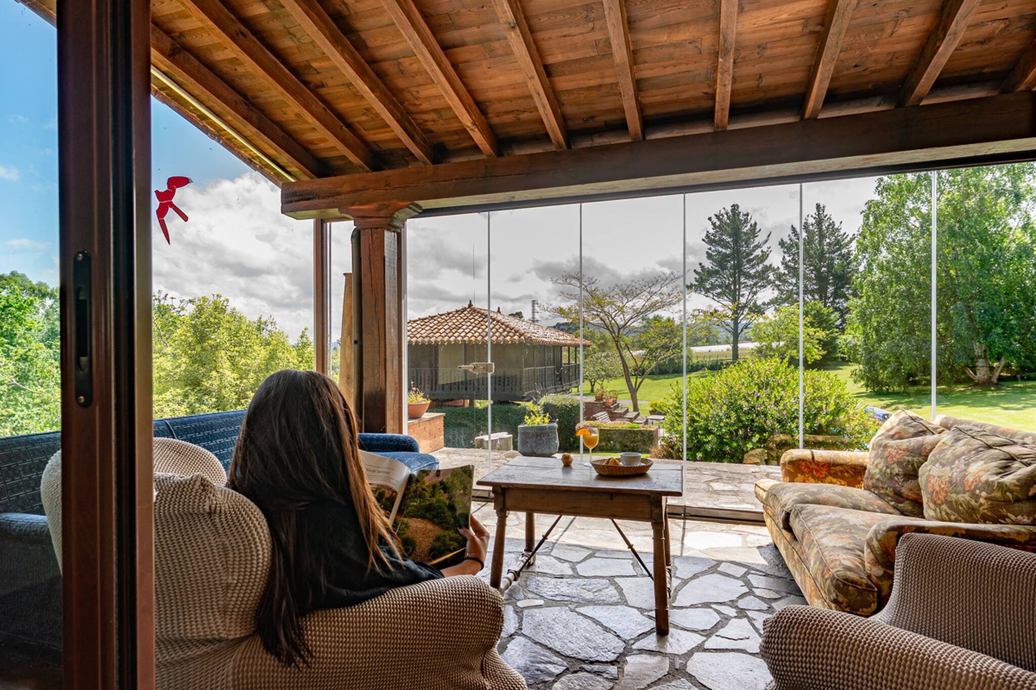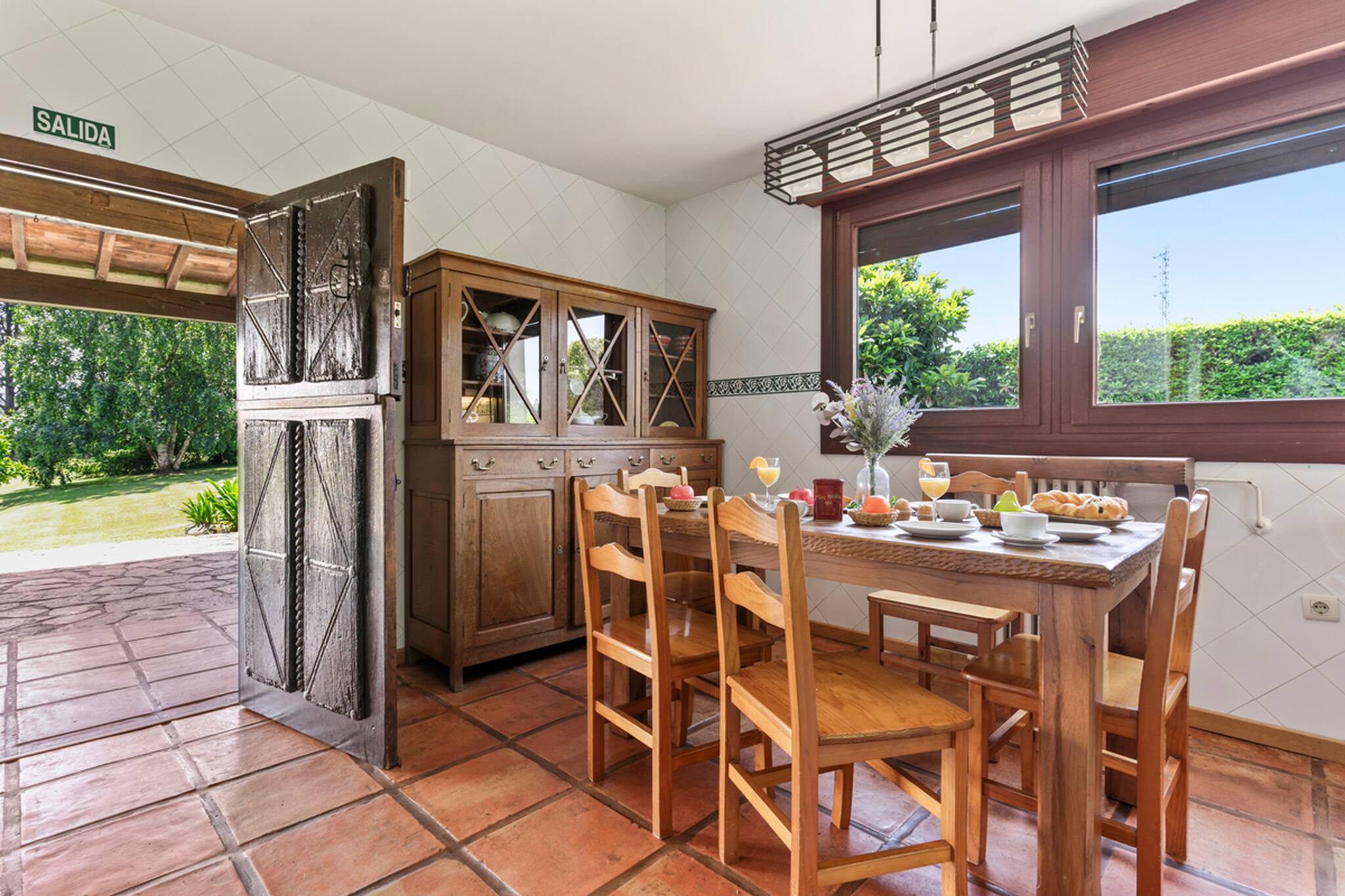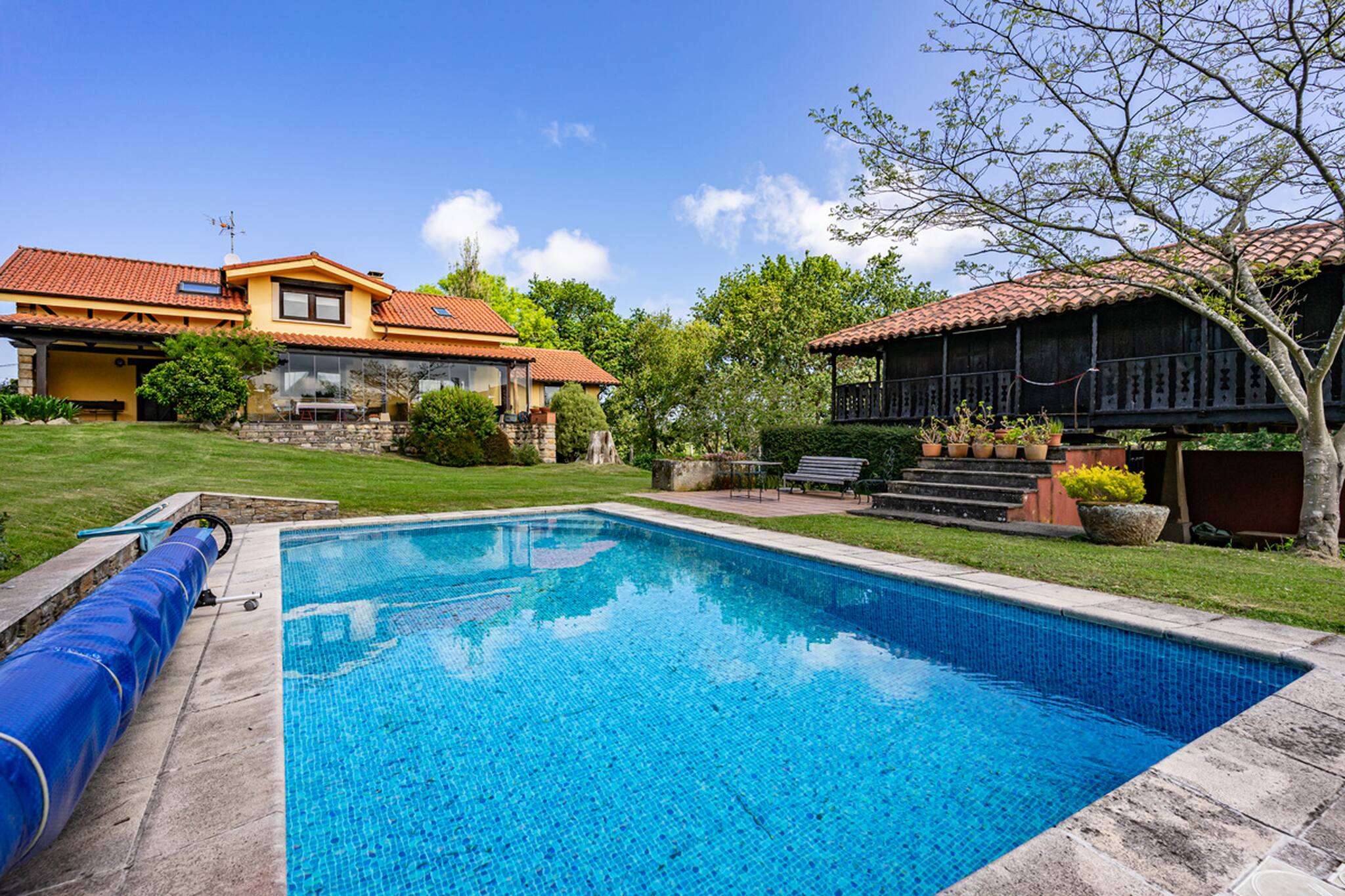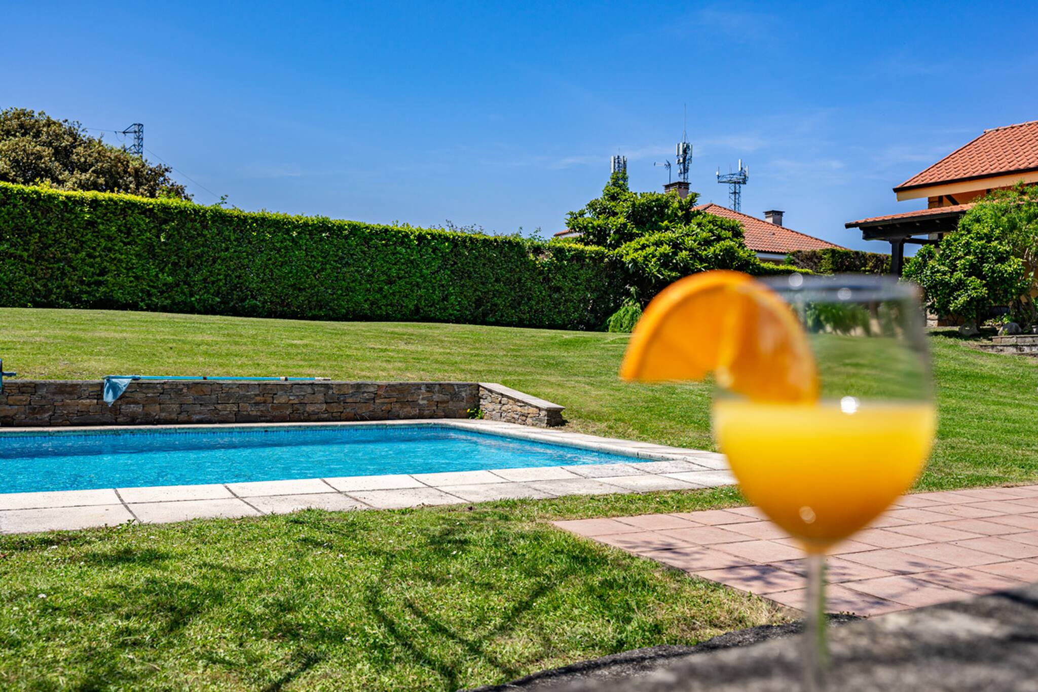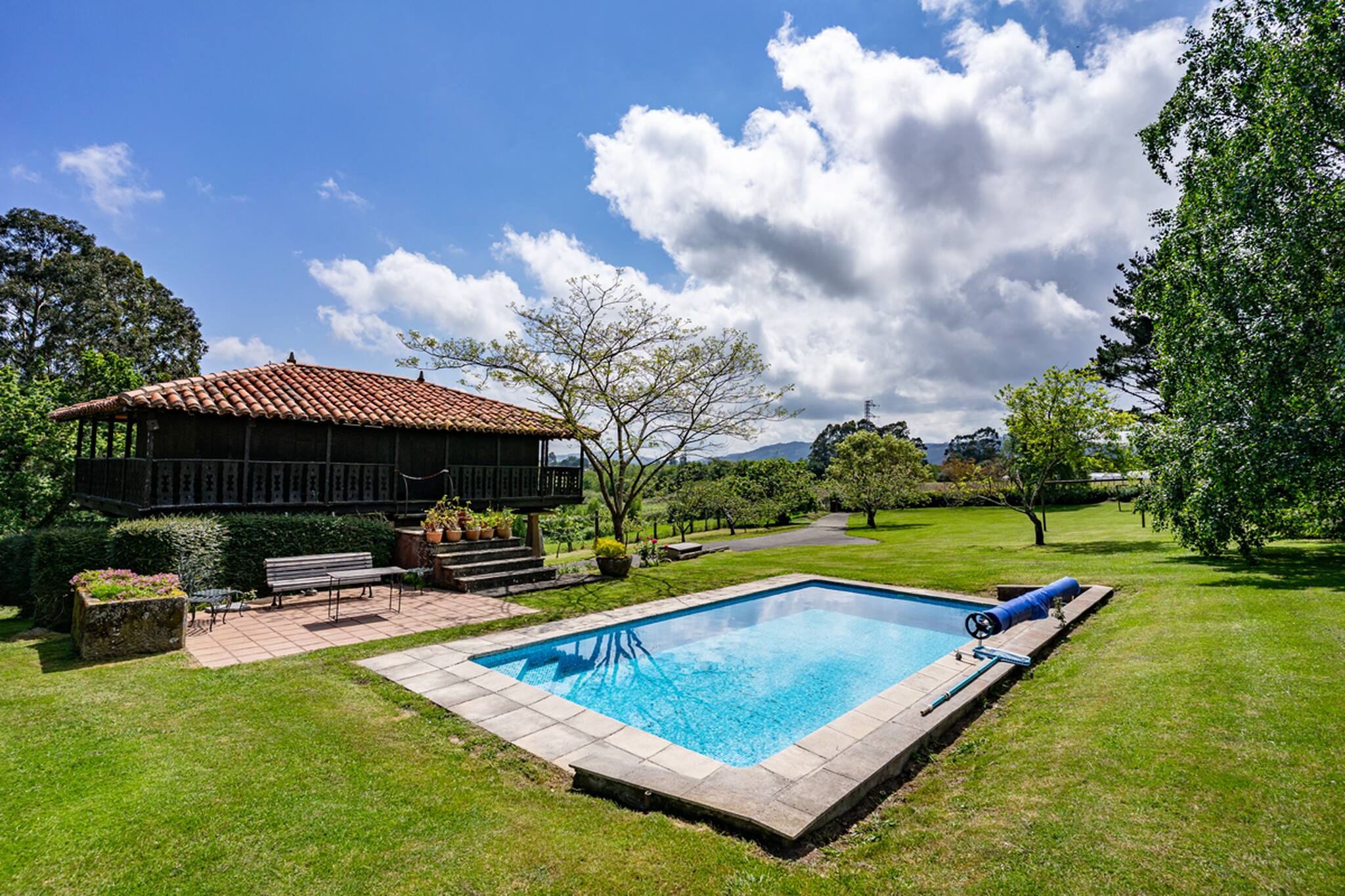 El exterior es uno de los grandes atractivos: una piscina privada de ensueño rodeada de zonas verdes, ideal para tomar el sol, refrescarse o simplemente relajarse con el sonido de la naturaleza.